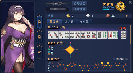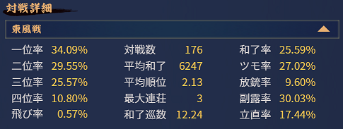 成績の見方ログイン画面の左上のアカウントをクリックすれば成績が見れます。今回は四人麻雀で見ていきますが▽のアイコンをクリックすれば三人麻雀になります。右上に...