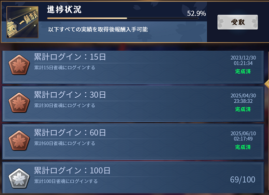 一飜市民は根気よくやれば誰でも得れますが、それでも連続ログイン100日と累計ログイン1000日はかなり時間がかかります。こうしてこのゲームに根付かせる制作者の意図が伺えます。