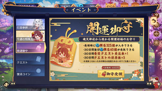 650円で開運御守を購入することができ、これによって上に書かれている特典を得ることができます。初回購入時には385個の輝石を得ることができ、次からはログインの度に60輝石が貰えます。30日で計2152個の輝石を得られますがログインしなかった日は得られません。毎日ログインしてユーザーを手なずける上手い事を考えたなっと思いました。しかしそれでも初回の輝石パックで買うと1076円に相当するため相当にお得だと思います。課金ですので37ポイントの契約ポイントが付きます。個人的にはこれを30日毎に購入して毎日ログインして楽しむのが一番コスパが良く手頃だと思います。