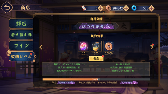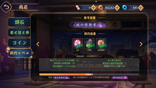 輝石や着せ替え券の購入なり、開運御守の購入なり課金をしますと契約ポイントというのが付きます。これがある一定になると称号と契約特典を得ることができます。レアアイテムの入手や段位戦絆ボーナスポイントが増えるのは嬉しいです。尚契約ポイントは購入の際にいくら付くのか見ることができます。こうしてみますとやはり課金のメリットはそれなりにあると思います。