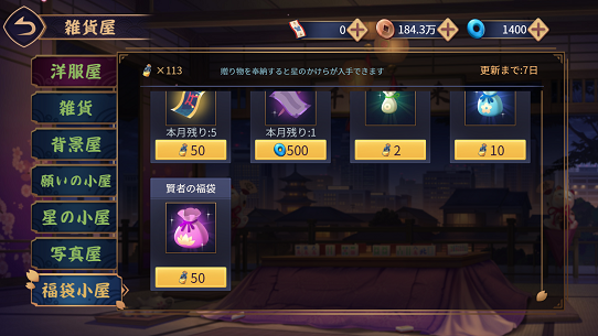 福袋小屋では星のかけらとガチャ券、緑の福袋、青の福袋、紫の福袋と交換できます。尚星のかけらは倉庫で不要な贈り物を奉納すると手に入れられます。(緑の贈り物は1個、青の贈り物は5個、紫の贈り物は25個貰えます。)
