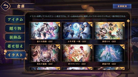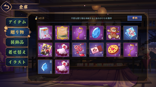 集めた贈り物を見ることができます。贈り物は雀士へ贈って絆ポイントを上げることができます。また紫の贈り物は雀士と契約する時に必要です。不要な贈り物は奉納すると星のかけらに変換されます。(緑の贈り物は1個、青の贈り物は5個、紫の贈り物は25個に変換されます。)尚鎖付きの贈り物は奉納することができません。