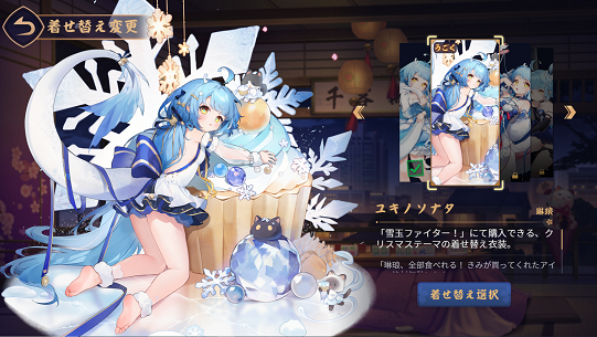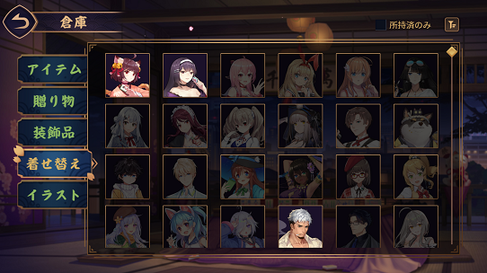 キャラの着せ替えは所持していればここでできます。所持していないキャラの衣装も見れますので参考にして下さい。