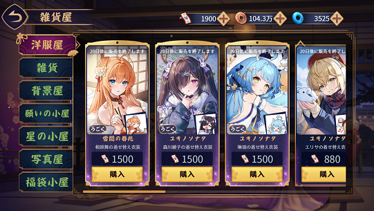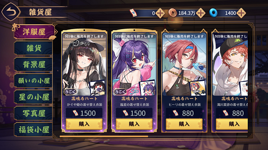キャラの着せ替えを着せ替え券で購入できます。着せ替え券は商店で課金によって手に入れるもので、1着せ替え券2円相当です。動作のあるものは1500着せ替え券、動作の無いものは880着せ替え券で購入できます。着せ替えパターンはキャラによって異なり、初期と契約を除いて1〜7パターンくらいあります。例えばジョセフなどは1パターンしかありませんが、八木唯は7パターンもあります。購入できる着せ替えは時限的に変わります。尚所持していないキャラの着せ替えを購入しても他のキャラに着せ替えることはできません。