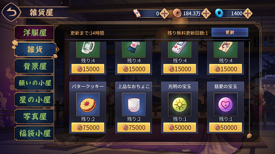 雑貨ではコインで緑の贈り物と青の贈り物、宝玉を購入できます。購入できる品は時限的に更新します。