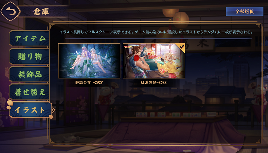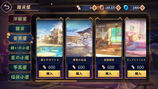通常画面の背景を600着せ替え券で購入できます。和風の物から洋風の物、季節物といろいろあります。