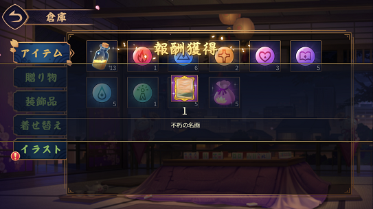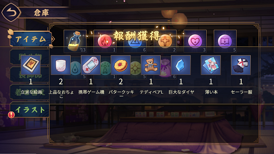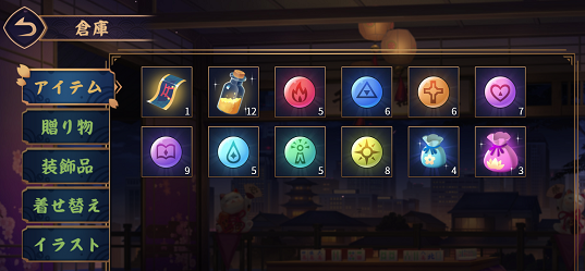 これらのアイテムは祈願に使ったり、雑貨屋で装飾品と交換できます。宝玉は勇気の宝玉(赤)、意志の宝玉(青)、誠実の宝玉(橙)、慈愛の宝玉(紫)、知恵の宝玉(青紫)、純真の宝玉(水)、希望の宝玉(緑)、光明の宝玉(黄)の8種あり、雀士と契約を結ぶ時必用です。また写真屋でイラストと交換することもできます。福袋は貴族の福袋(青)、賢者の福袋(紫)があり、それぞれ青色の贈り物と紫の贈り物をランダムに1個入手することができます。他にも願いの石や星のかけら、星の石があります。