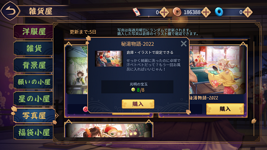 試しに写真屋にて光明の宝玉で秘湯物語-2022を購入してみました。これには光明の宝玉8個が必要です。